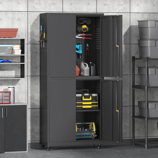 71" H Metal Tool Storage Cabinet with Lock and Wheels, Heavy Duty Garage Cabinet with 4 Doors and 2 Adjustable Shelves, Tool Organizer with Pegboard for Garage, Warehouse(Black, 71" H)