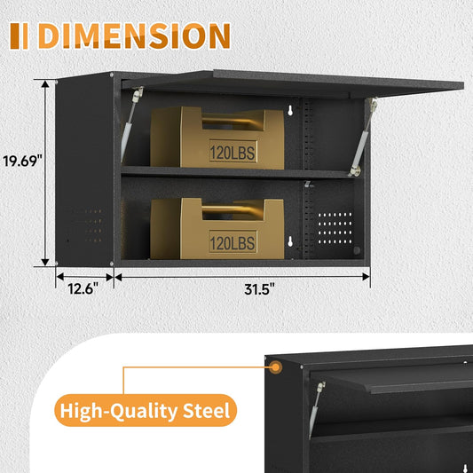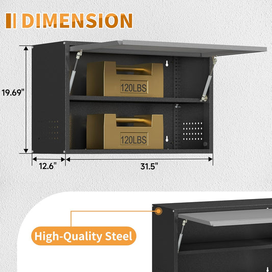 Metal Garage Wall Cabinet with Up-Flip Door, Float Tool Cabenit with Adjustable Shelf,Steel Wall-Mounted Storage Cabinet with Pegboard for Kitchen,Garage,Workshop,Warehouse(19.7"H,Black&Gray)