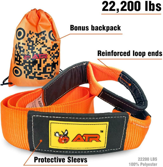 ATR Recovery Tow Strap 3" x 20ft – 22,200 lbs Breaking Strength, Heavy Duty Snatch Strap for Truck, SUV, Off-Road Pulling, Tow Rope with Storage Bag