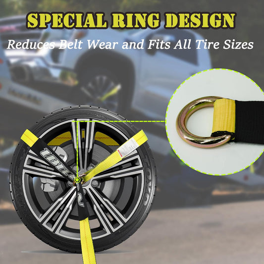 4 Pack Car Tie Down Straps for Trailers - 2" x 96" - 3,300 lbs Safe Working Load -Adjustable Wheel Straps for Hauling Cars.Yellow