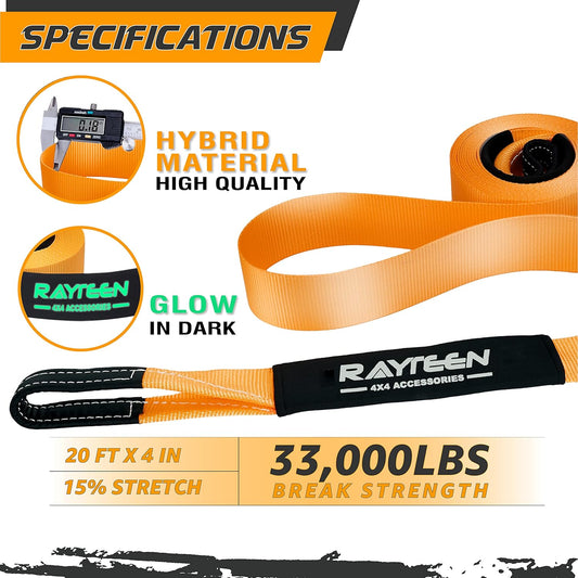 Genuine 33,000lb Xtreme Heavy Duty Recovery Tow Strap(20ft x 4in) + 20,000lb Tree Saver Strap(8.2ft x 3in) | Include Reflective Sleeve & Reinforced Loop | Suits for 4x4 Offroad UTV ATV Trucks