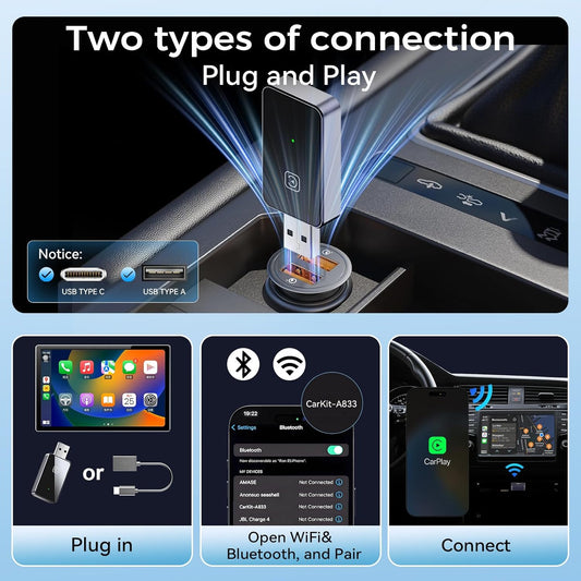 Mini Wireless CarPlay Adapter for iPhone 2025 Upgraded, Plug & Play, No Latency, USB-A/C Support, Compatible with iOS 10+ & Cars 2016+