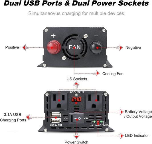 LVYUAN 1000 Watt Pure Sine Wave Power Inverter 12V to 110V/120V DC to AC Converter with Dual Sockets, Dual USB Ports, LED Display for Home Outdoor RV Car Power Inverter Power Adapter