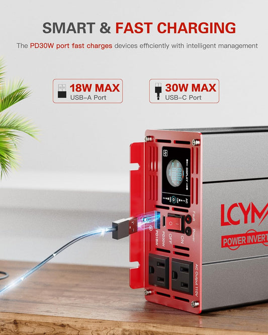 1500 Watt Pure Sine Wave Power Inverter DC 12V to AC 110/120V with Dual Outlets USB-C 30W USB-QC 18W Fast Car Charger Adapter LCD Display and Remote Control Converter for Off-Grid Home RV Solar System