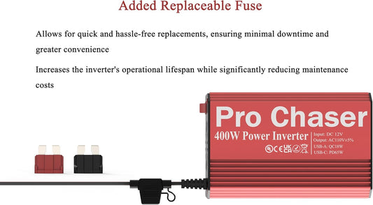 Pro Chaser 400W Vehicle Power Inverter - 12V DC to 110V AC Car Converter, Dual AC Outlets, USB-A QC 18W & USB-C PD 65W Ports, Road Trip Charging Companion with Replaceable in-Line Fuse