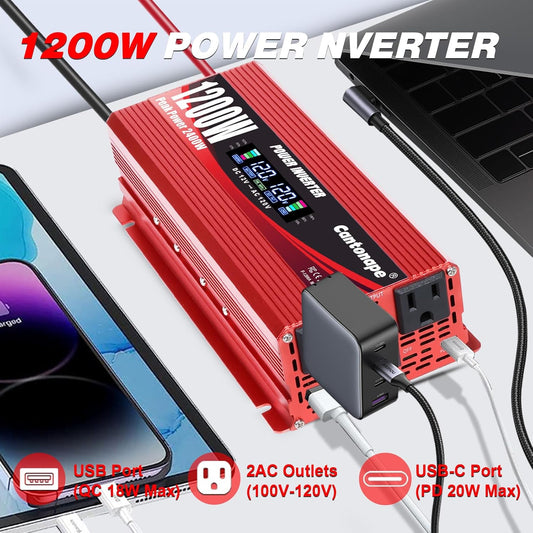 1200W/2400W(Peak) Power Inverter DC 12V to 110V/120V AC Converter with LCD Display Dual AC Outlets 3.0A USB and Type-C Car Inverter for Truck Vehicles Laptop Trip