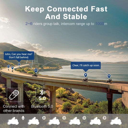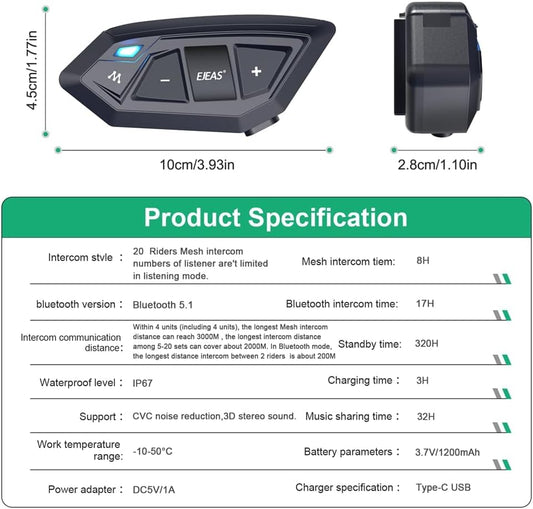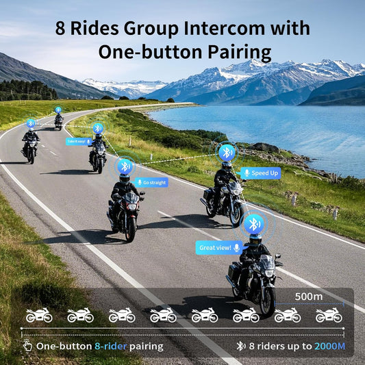 EJEAS Q8 2PC Motorcycle Bluetooth Headset, Upgraded Mesh 3.0 Intercom System with Music Sharing and IP67 Waterproof for 6 Riders Group Talking