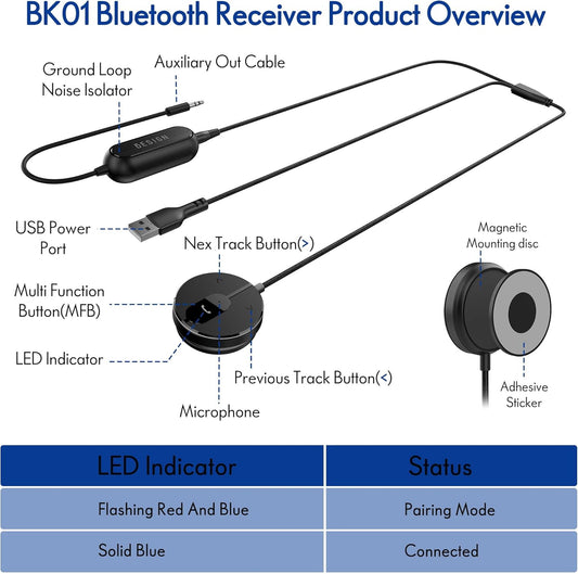 BESIGN BK01 Bluetooth Car Reciever with Ground Loop Noise Filter for car with 3.5mm Aux Jack