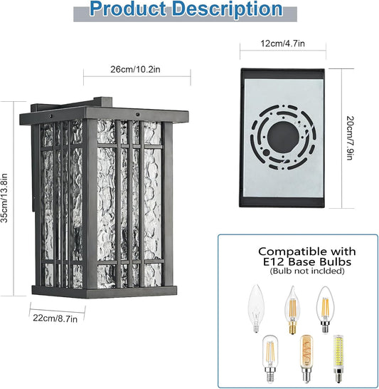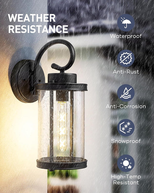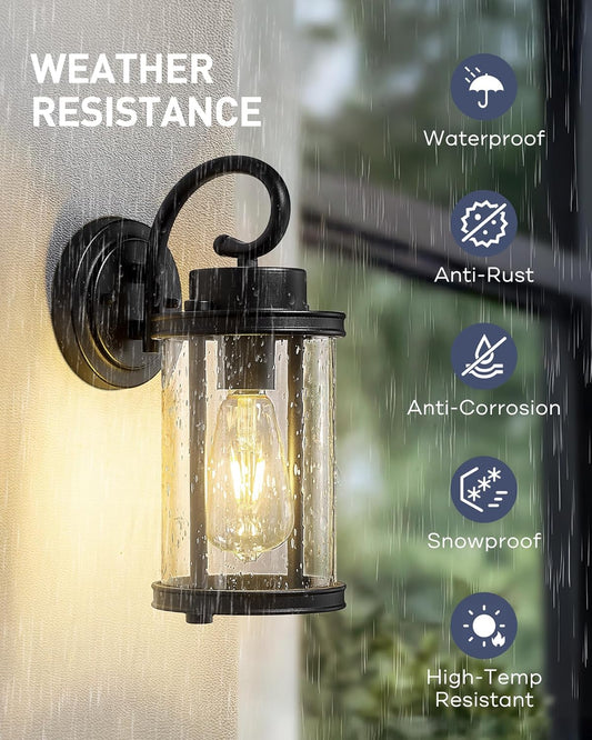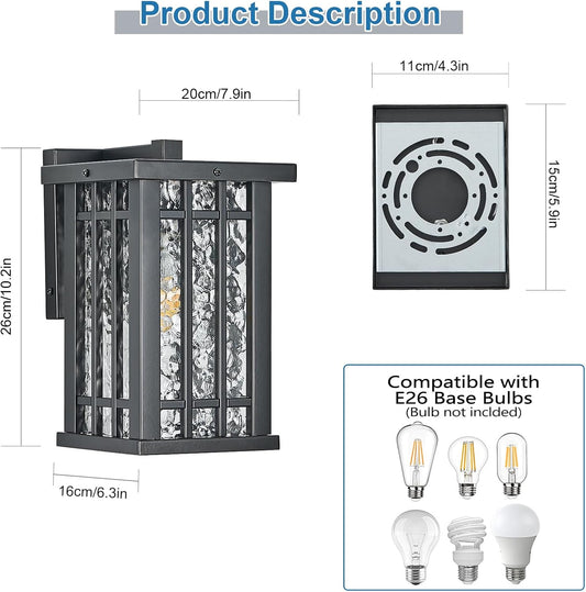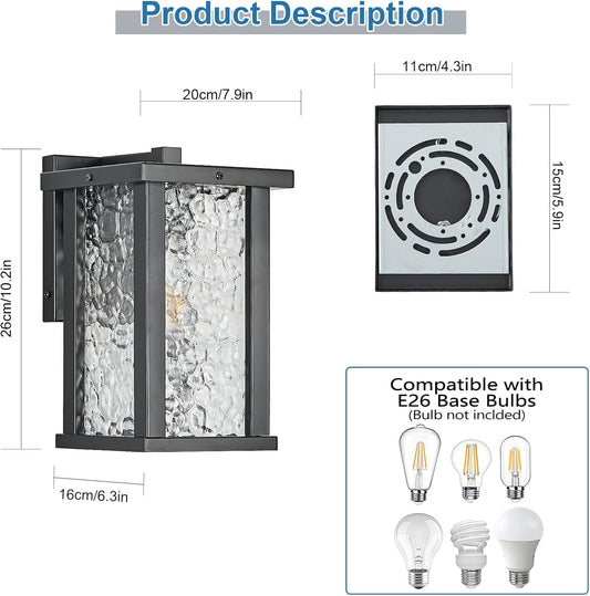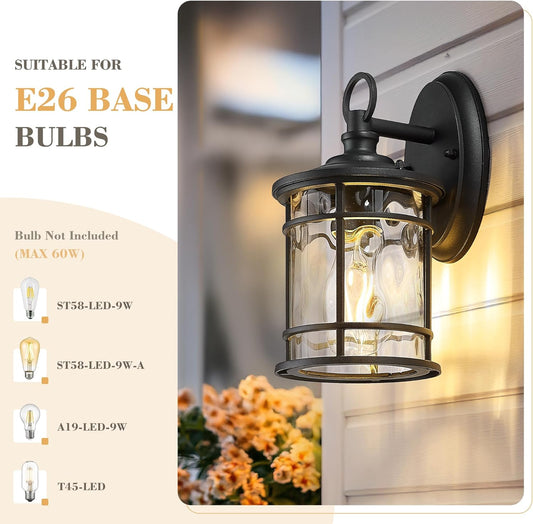 Emliviar 2 Pack Exterior Wall Sconce Light, Anti-Rust Outdoor Lanterns Wall Lamps, Farmhouse Patio Lightings with E26 Socket & Water Ripple Glass, Black Finish, XE229BS-2PK BK-WG
