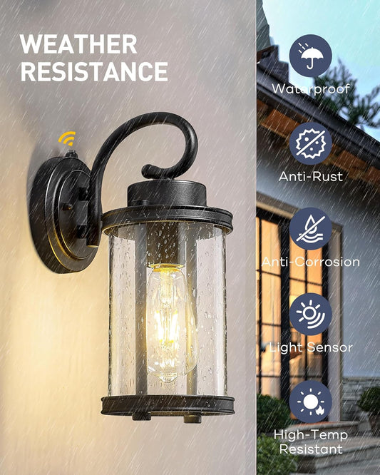 kudos Dusk to Dawn Outdoor Lighting, 12.5 inch Porch Lights Outdoor, Anti-Rust Waterproof Cylinder Wall Light for Patio, Garage, Black with Seeded Glass, KDOWL01-BK-LC