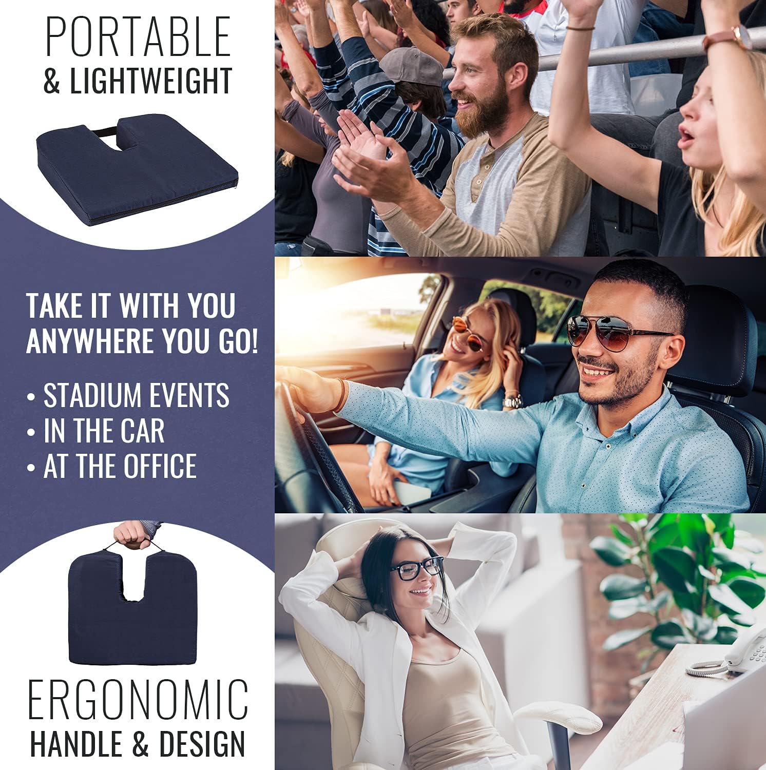 - WEDGE CUSHION is great for traveling or to bring to events like sporting games where hard stadium seats are uncomfortable and painful.