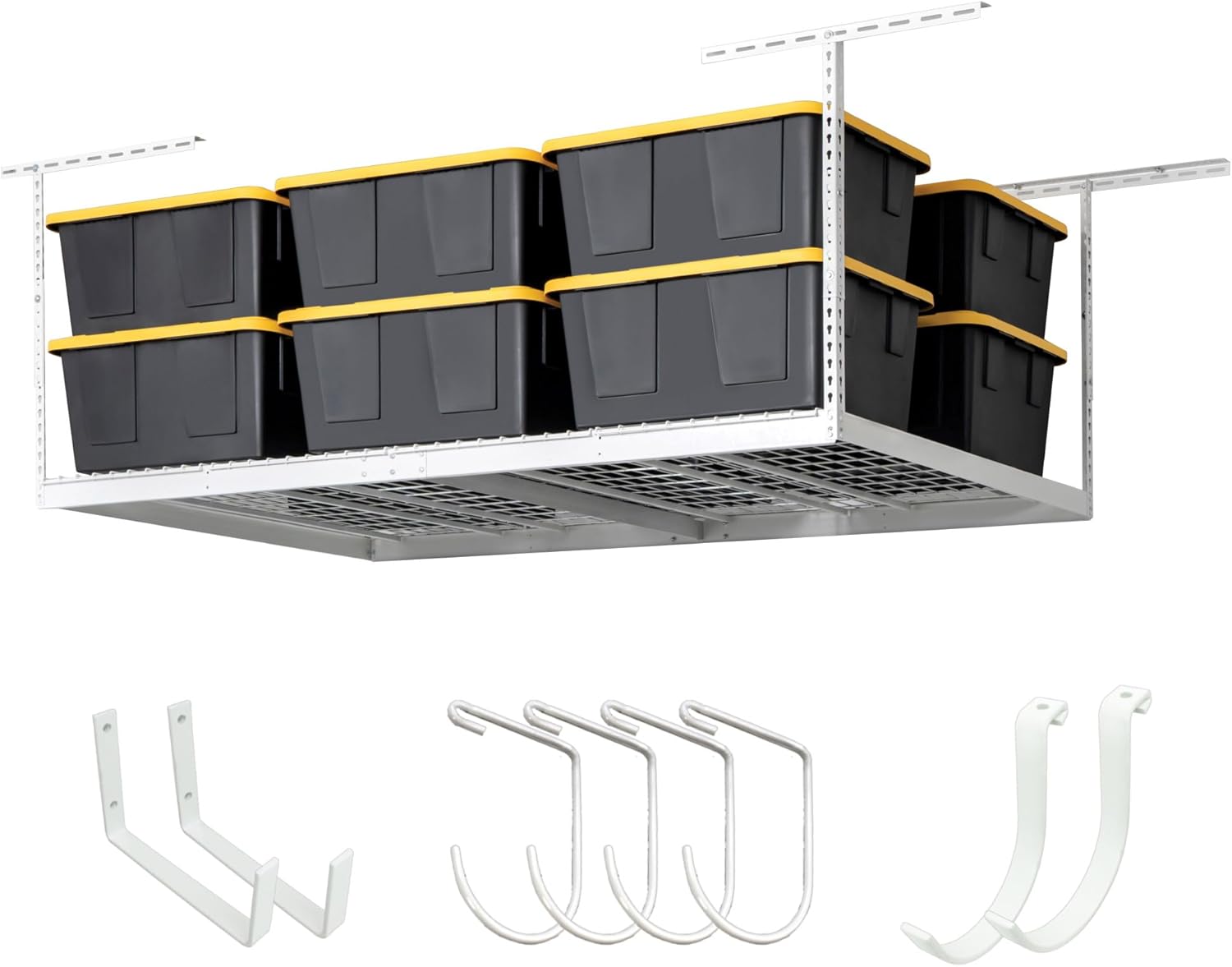 SafeRacks 4 ft x 8 ft Overhead Storage Rack Adjustable 24 in - 45in Height (White) With Accessory Pack With 8-Piece Deluxe Hook Accessory Pack
