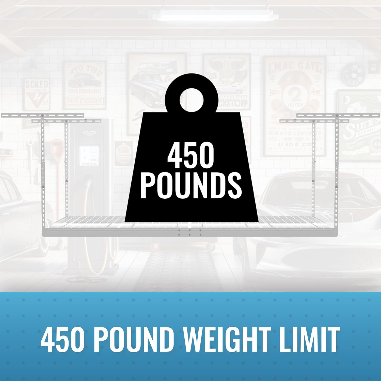- INDUSTRIAL STRENGTH: Our industrial strength overhead garage racks are designed to hold up to 450 lbs and are perfect for storing bikes, construction tools, storage bins, holiday decorations, and other items and accessories. The powder coat finish provides a durable, scratch, water, and rust-resistant surface; while case-hardened hardware and our patented ceiling brackets provide additional strength and safety for this hanging shelf.