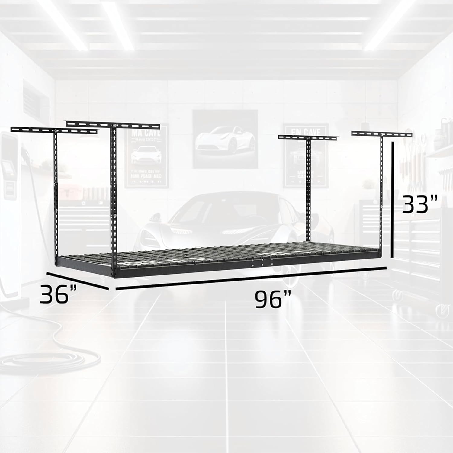 - ADJUSTABLE CEILING HEIGHT: Convert your garage from functionless to functional space. Our ceiling organizer has an adjustable drop-down range letting you customize the distance between the shelf and ceiling from 24" to 45". This 3 foot by 8 foot ceiling-mounted rack adds up to 60 cubic feet of storage.