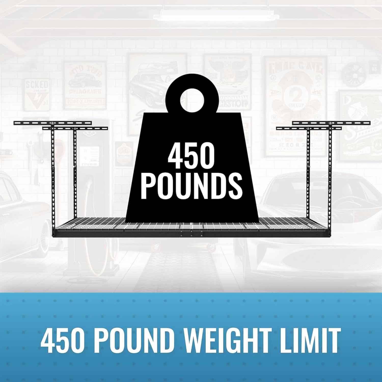 - INDUSTRIAL STRENGTH: Our industrial strength overhead garage racks are designed to hold up to 450 lbs and are perfect for storing bikes, construction tools, storage bins, holiday decorations, and other items and accessories. The powder coat finish provides a durable, scratch, water, and rust-resistant surface; while case-hardened hardware and our patented ceiling brackets provide additional strength and safety for this hanging shelf.