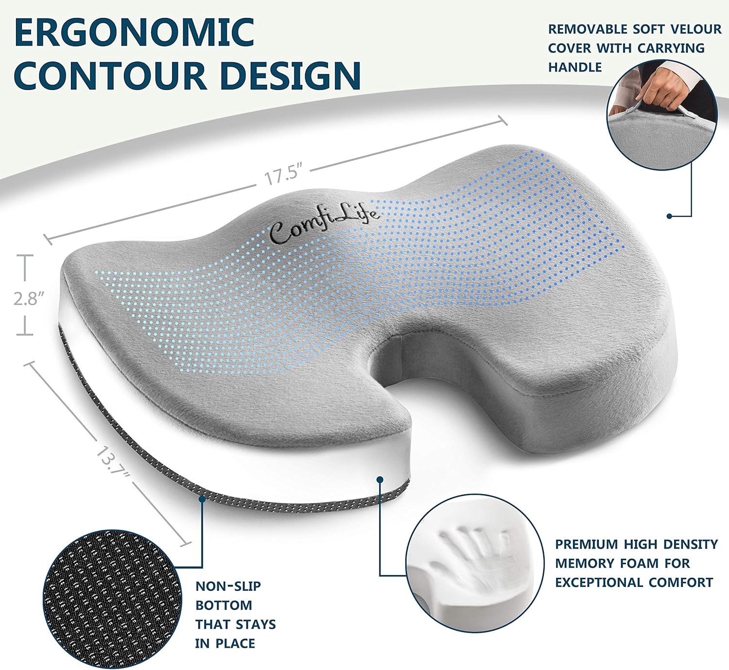 ComfiLife Premium Comfort Seat Cushion - Non-Slip Orthopedic 100% Memory Foam Coccyx Cushion for Tailbone Pain - Cushion for Office Chair Car Seat - Back Pain & Sciatica Relief (Gray)