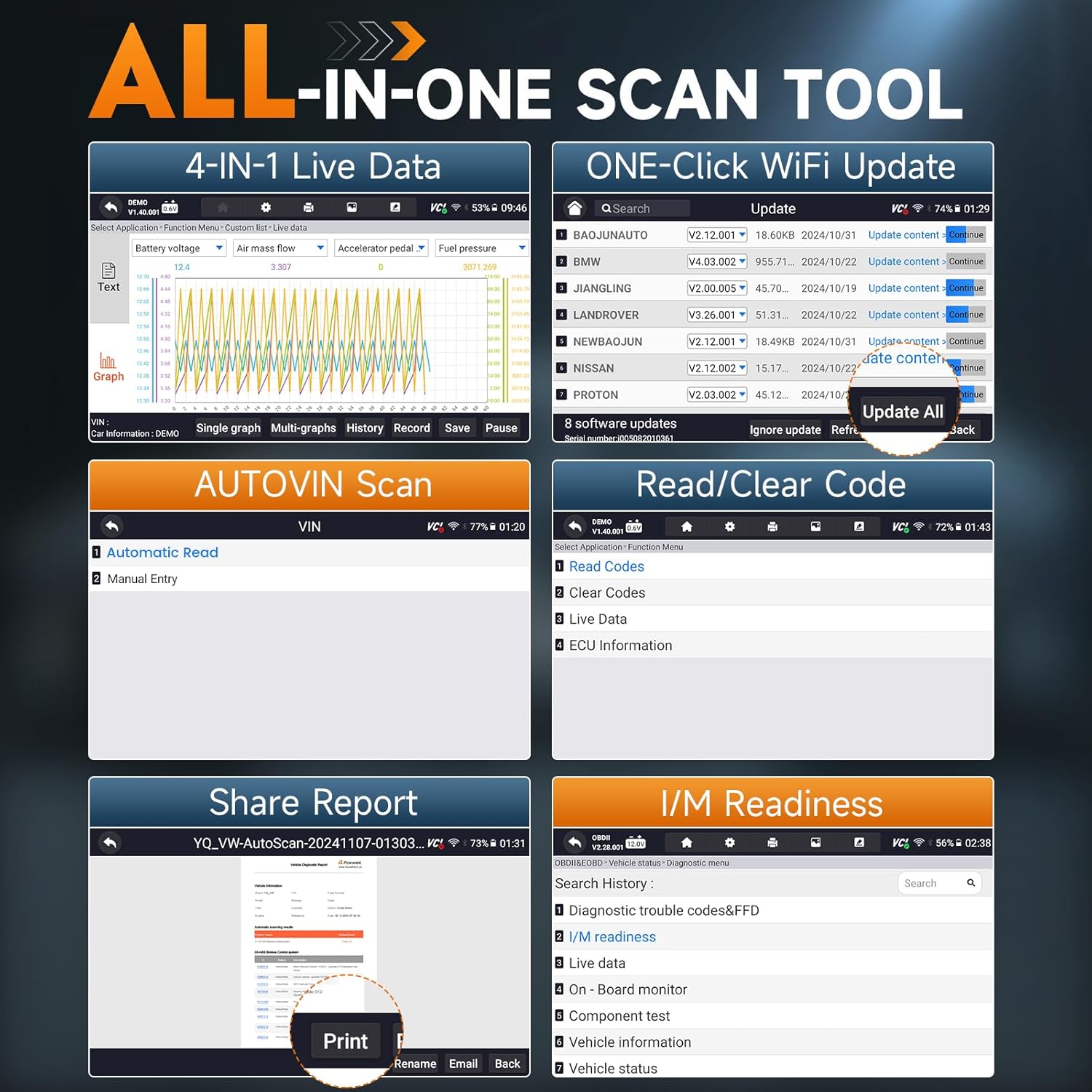 - 5.5" HD Touchscreen Tablet Car Scanner – Say goodbye to the confusion of small 2.8" code scanners with multiple buttons. Featuring a built-in 4000mAh battery, the new version offers greatly improved battery life. No subscriptions or hidden fees—share reports anytime and get free one-click WiFi updates. Runs on Android 9.0, supports 24+ languages, and works with over 100 car brands from 1996 to 2025.