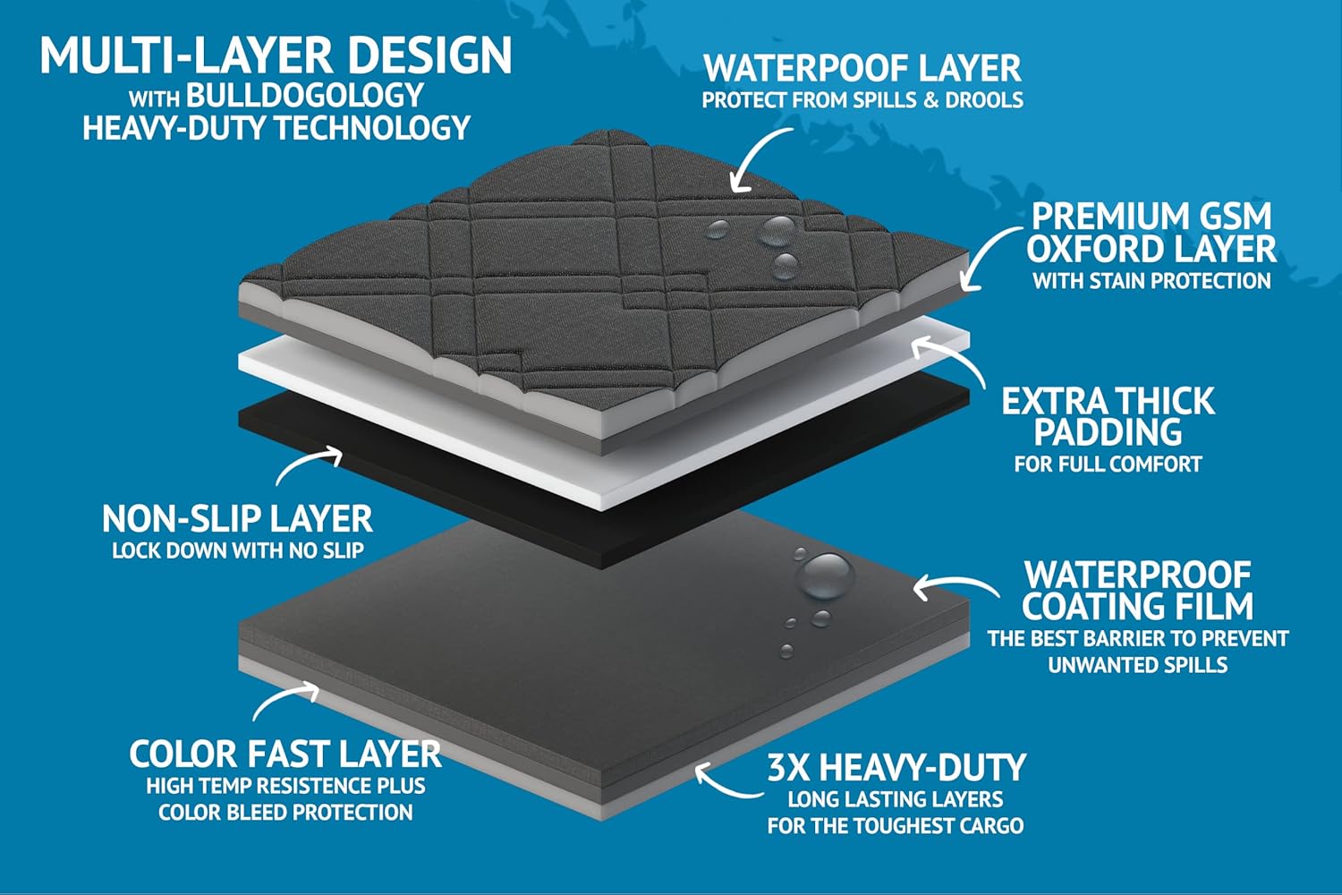 - Shield your backseat from dog hair, muddy paws, and scratches with Bulldogology's Heavy Duty Protector. Crafted from premium 600D GSM Oxford Material, our car pet seat cover offers robust defense. Side flaps and extra thick layers ensure all-around protection. Drive worry-free with this back seat cover for dogs, backed by double stitched quilted construction for lifetime satisfaction. Travel comfortably with your furry companion, knowing your car stays clean and stylish.