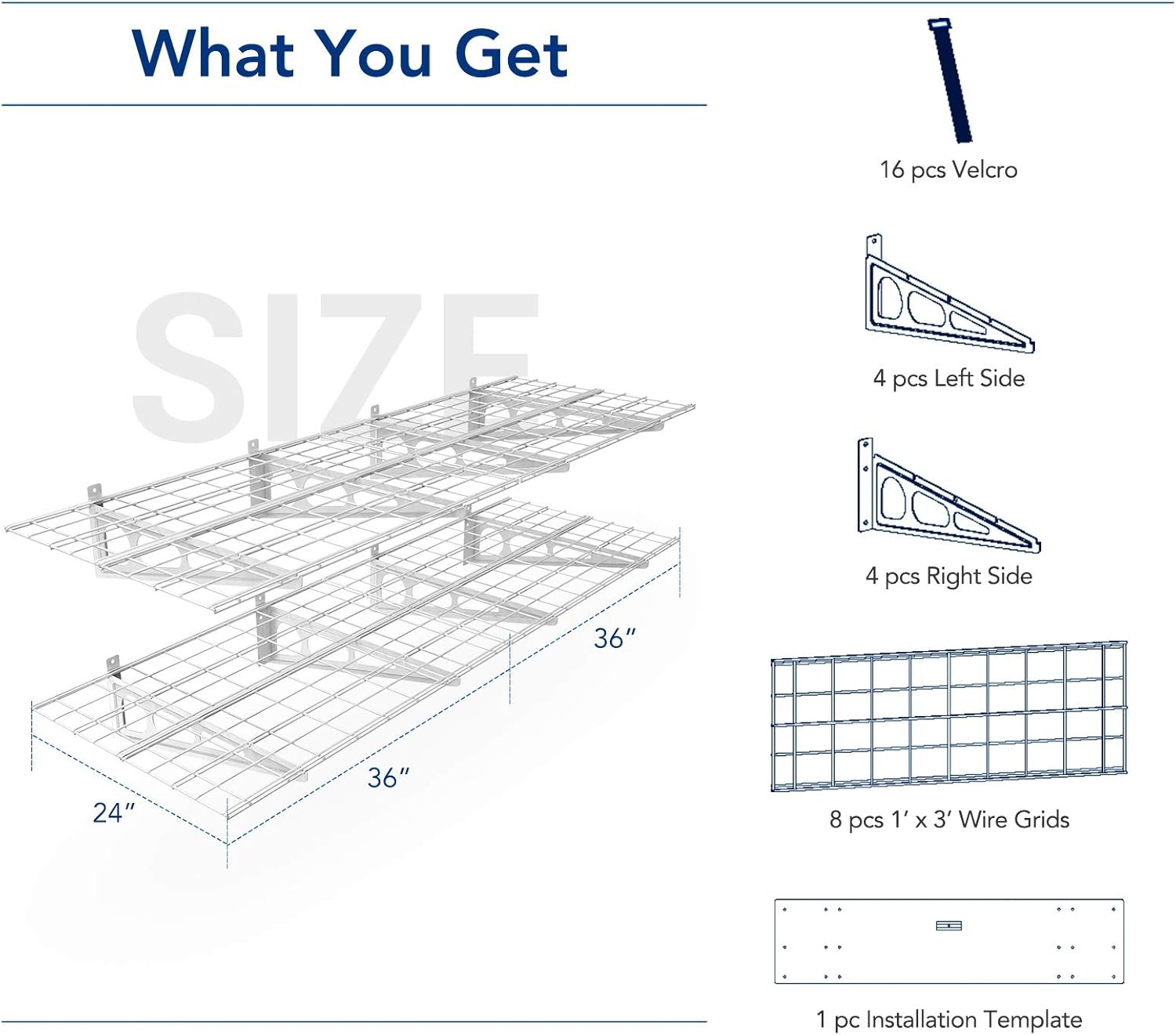 - This 2x6 ft garage shelf offers ample storage space for your garage, small pantry, or kitchen. (Composition of four 1'x3' shelves per tier). Perfect for organizing bulky items such as tools, tires, and heavy storage bins, this wall shelving is built tough to withstand extreme loads.