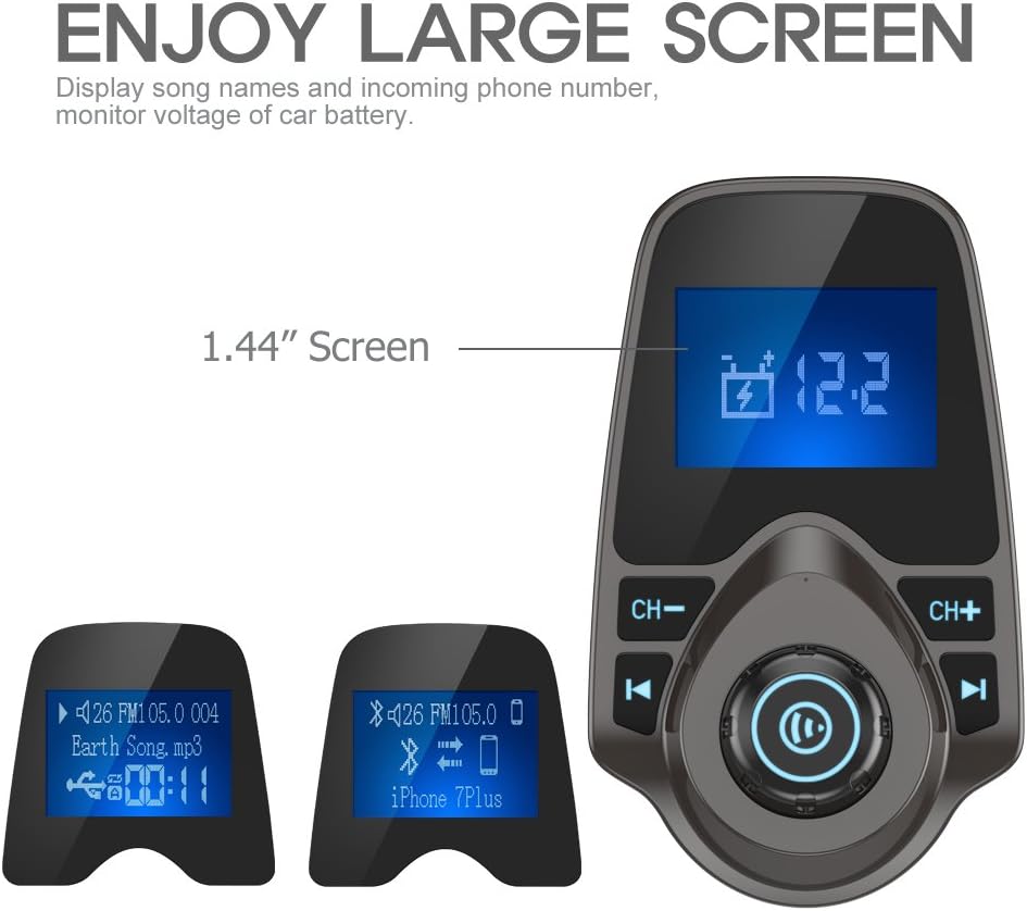 - 1.44 Inch LCD Display: Nulaxy KM18 Bluetooth FM transmitter has a 1.44 inch screen for better displaying information like phone calls, FM channels, music, car battery voltage, etc. The ideal screen size to assist you in driving safe without disturbance.