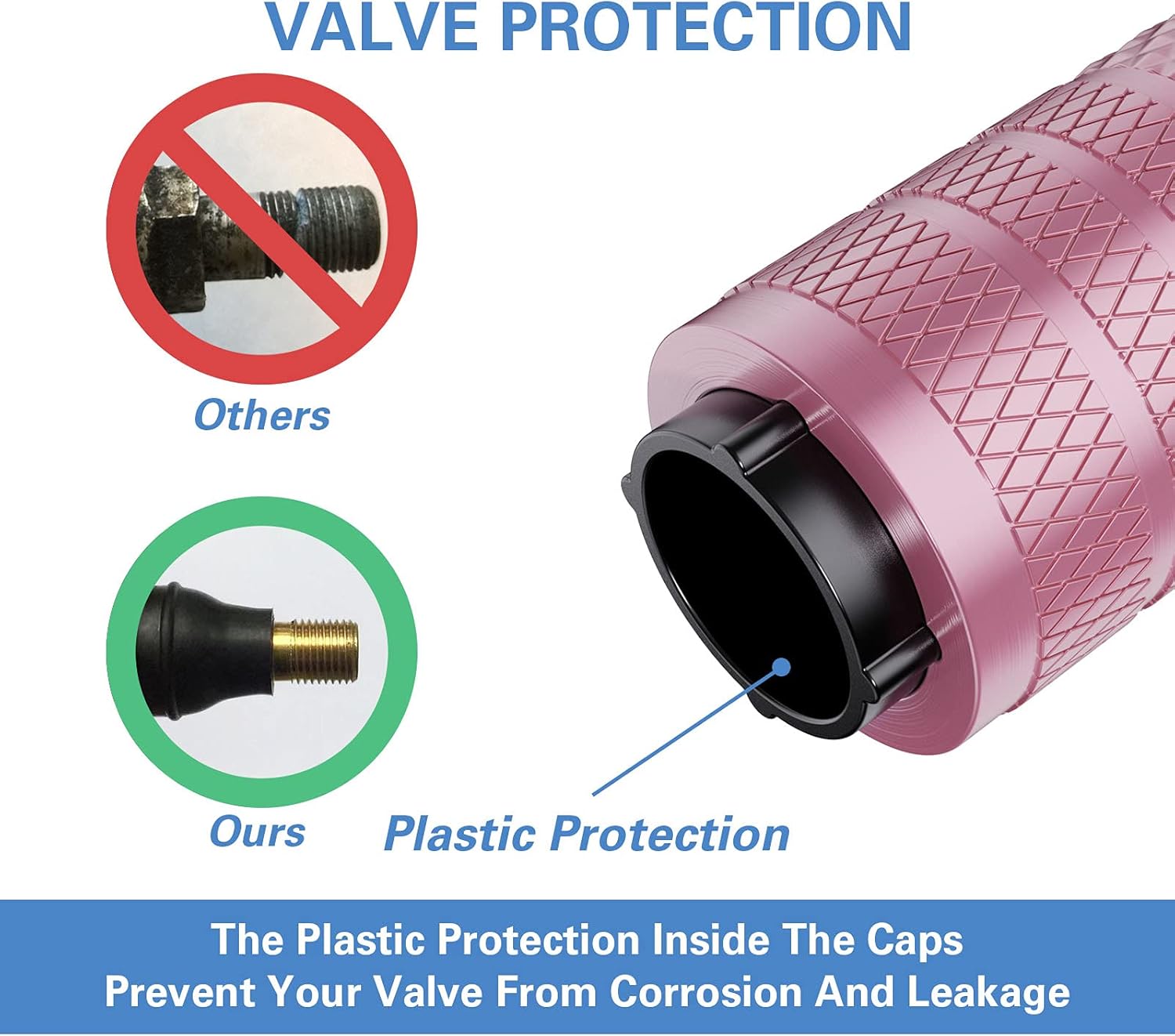 - Special Design – Metal materials are prone to rust in the presence of water and oxygen, which may lead to corrosion on valve body. The plastic inner valve caps design combines the attribution of corrosion resistance of plastic and the stylish look of metal.
