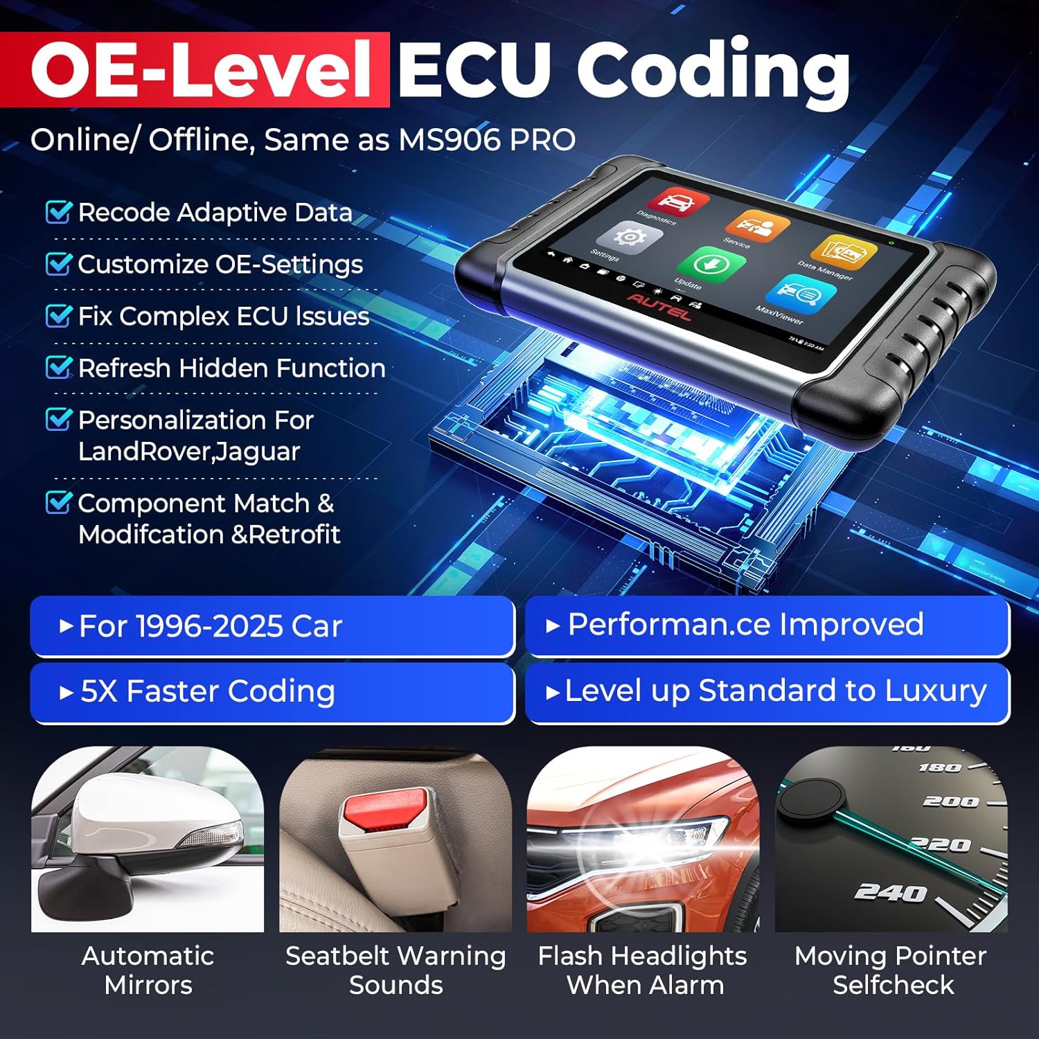 - 🚘【OE-Level ECU Coding, Same as MS906 PRO MS906 MAX】Differ from MK900-BT MK900 without ECU Coding, Autel MP808S escaner automotriz upgrades your car diagnostics ability! Featuring advanced ECU coding, same as Autel ms906 pro/mk908 pro ii. it allows to code ECU modules for 99% vehicles. Perform advanced functions such as Online/Offline Coding, Refresh Hidden Functions, Disable Annoying Features, Making Mo.di.fication, Power Balance, Customization, and Guided Function. It supports online coding for BMW, Porsche, VW, Nissan, Infiniti, Hyundai, etc; the offline coding/PMI for Ford, Mazda, Jaguar, Vauxhall, Opel, etc. VAG Guided offers step-by-step accurate guidance for Audi, VW, Skoda, Jetta.