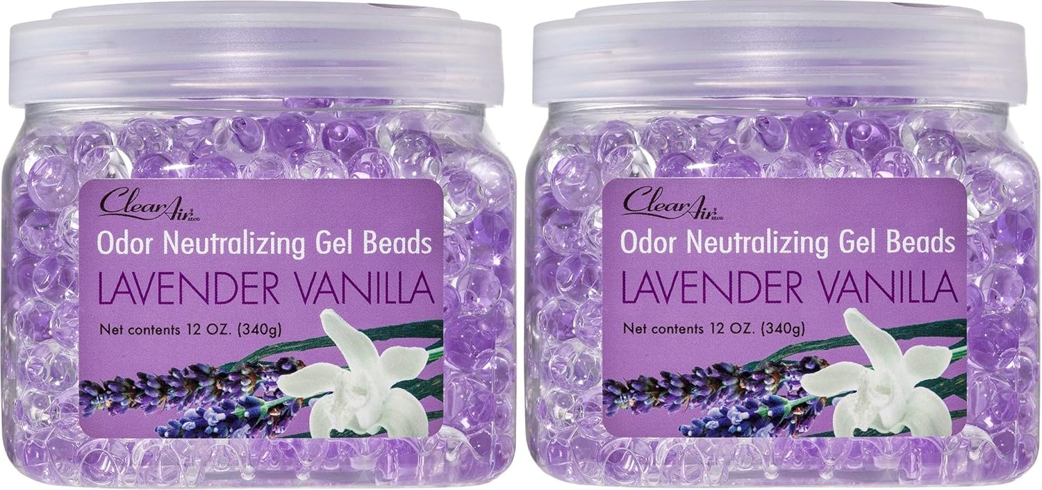 Clear Air Odor Eliminator Gel Beads - 12 oz, Pack of 2 - Air Freshener Made with Essential Oils - Eliminates Odors in Bathrooms, Cars, Boats, RVs & Pet Areas - Lavender Vanilla Scent