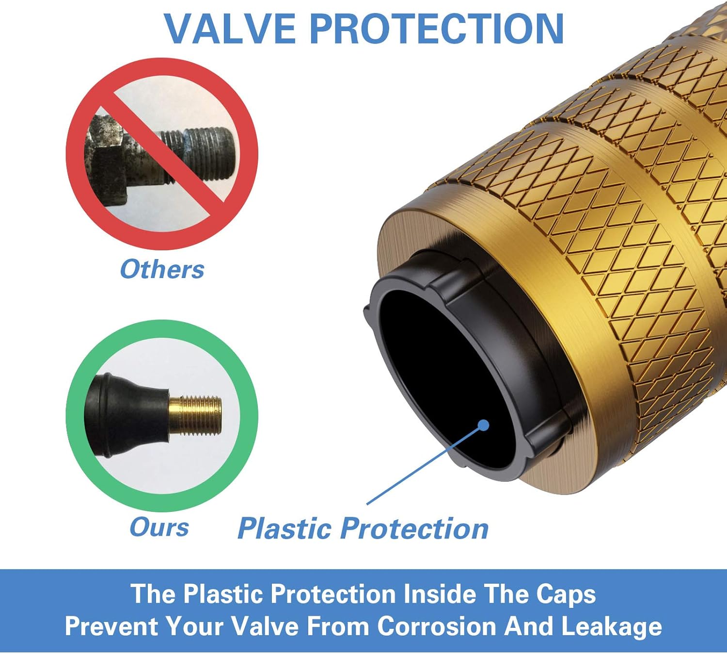 - Special Design – Metal materials are prone to rust in the presence of water and oxygen, which may lead to corrosion on valve body. The plastic inner valve caps design combines the attribution of corrosion resistance of plastic and the stylish look of metal
