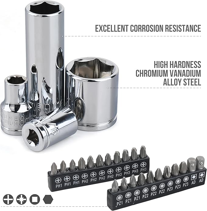 - Includes most popular 1/4", 3/8", and 1/2" drive sockets, hex keys, and screwdriver bits; both Metric and SAE sizes included