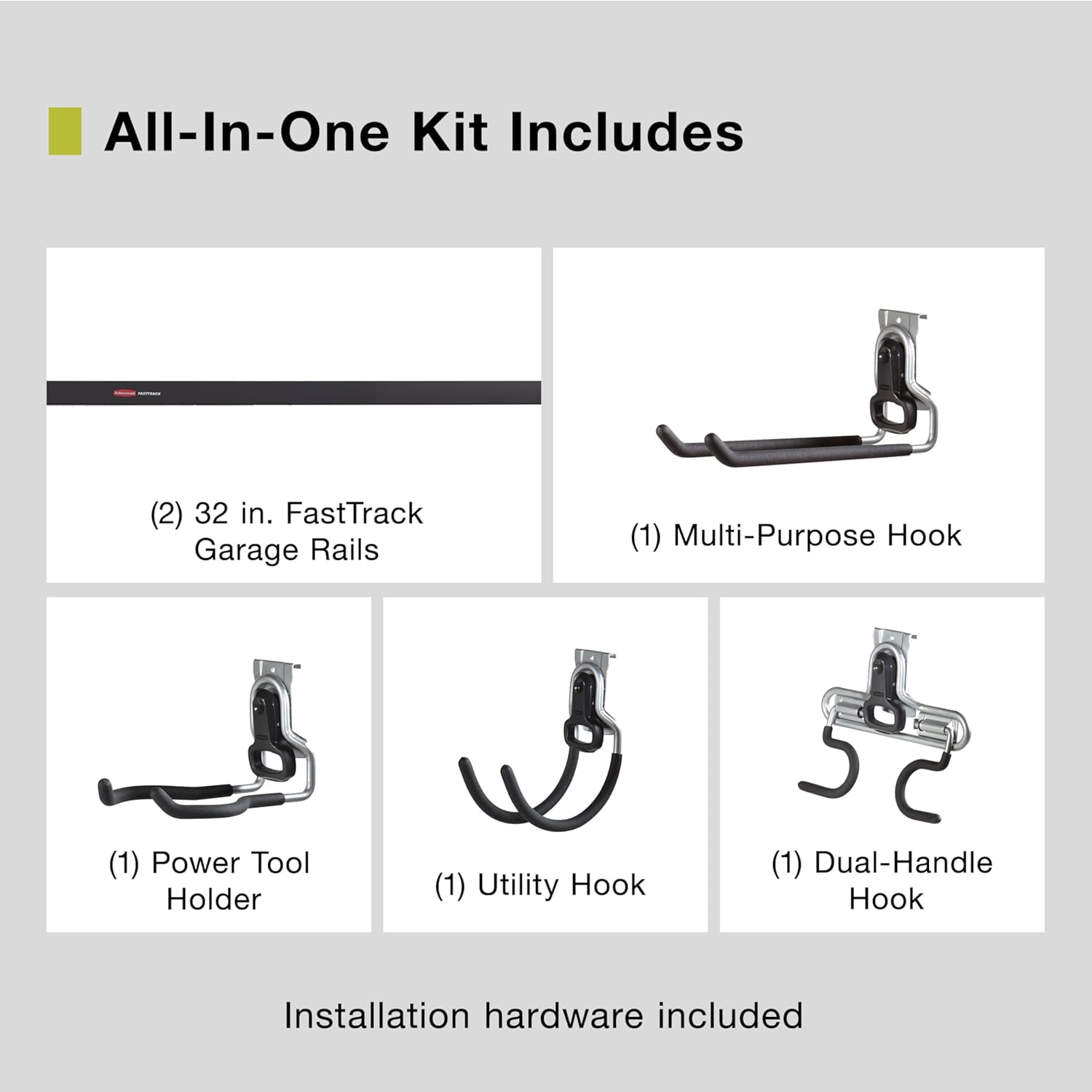- KIT CONTENT INCLUDES: (2) 32" Rails (1) Utility Hook (1) 2-Handle Hook (1) Power Tool Holder (1) Multi-Purpose Hook