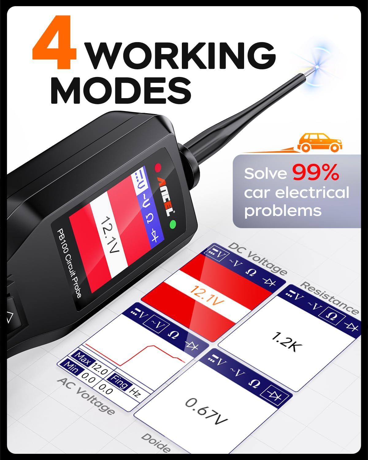- 🩺【What In The World Is A PB100 Probe Tester?】The ANCEL PB100 test probe is the revolutionary circuit tester, replace multimeters/test lights/jumper wires, and fuse tester. It's like a detective for your car's electrical system, with four super-accurate diagnostic modes (✅DC Voltage, ✅AC Voltage, ✅Resistance, ✅Diode). Just plug, press, and probe to fix 99% of electrical issues—batteries, trailer lights, faulty relays & more. it's the ultimate sidekick for car owners, get ready to solve any electrical mystery under the hood!