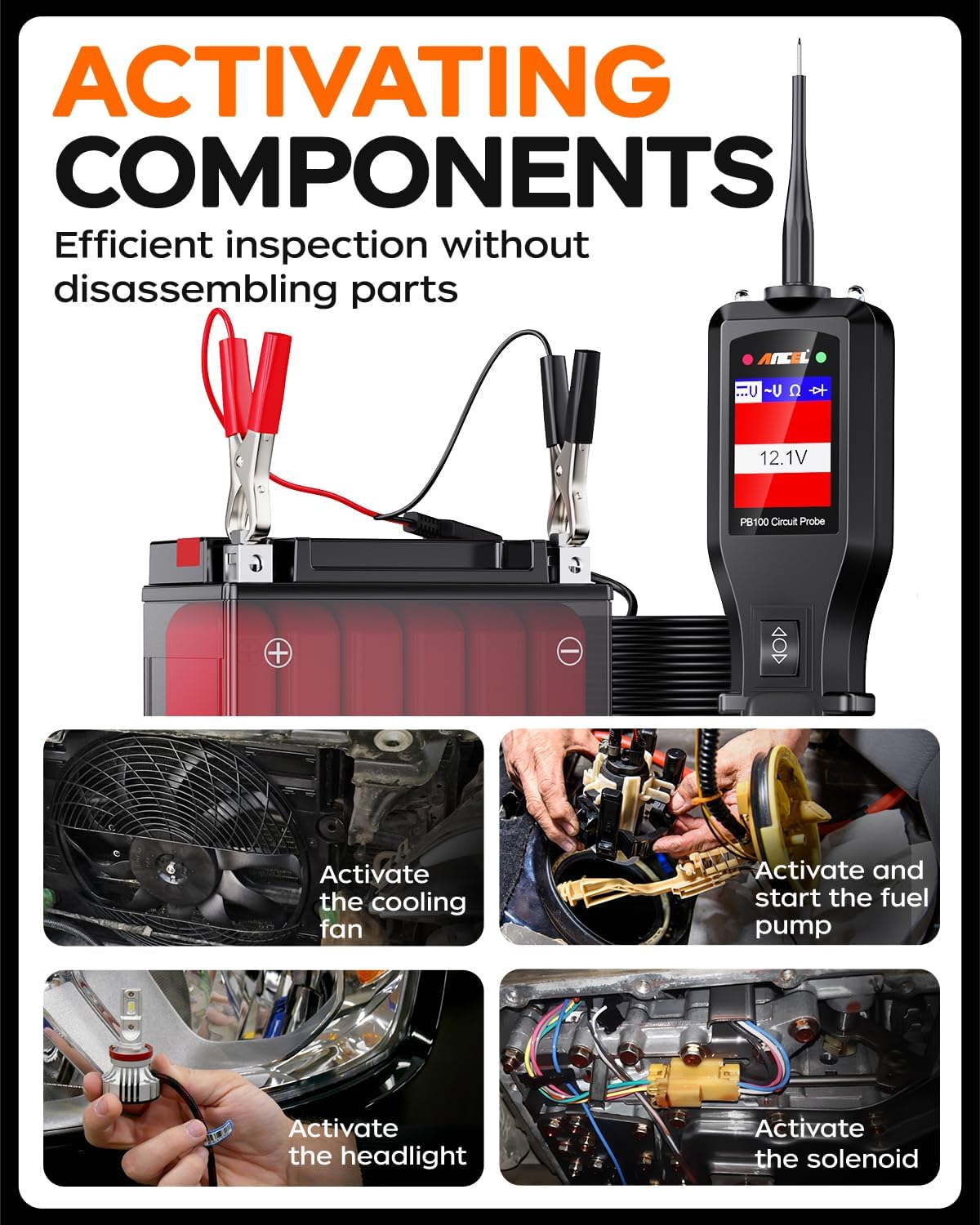 - 🌈【All-In-One Power Circuit Probe Tester Kit】Hey there, car machinist and DIY auto wizards! Get ready to meet the ANCEL PB100 circuit tester automotive, the ultimate gadget for your vehicle's electrical jungle. It supports ⚡Circuit Breaker/Open Test ⚡Tracing Wire ⚡AC/DC Voltage Test ⚡Diode Test ⚡Resistance Test ⚡Polarity Test ⚡Continuity Test ⚡Ground Test ⚡Activate Components ⚡Signal Circuit Test ⚡Relay, Fuse, Trailer Light Test. So, what are you waiting for? Grab it and start your electrical adventure today!