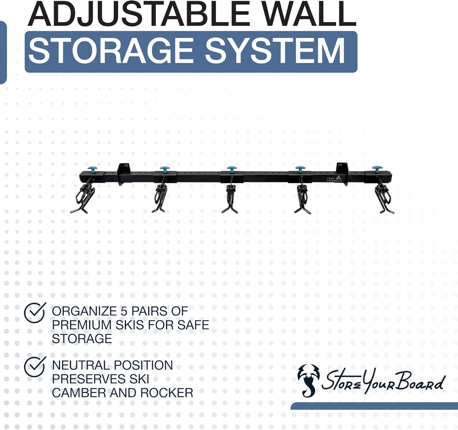 - ORGANIZED SKI STORAGE: Adjustable wall storage rack neatly holds up to 5 pairs of powder skis, rocker skis, racing skis, and all mountain skis.