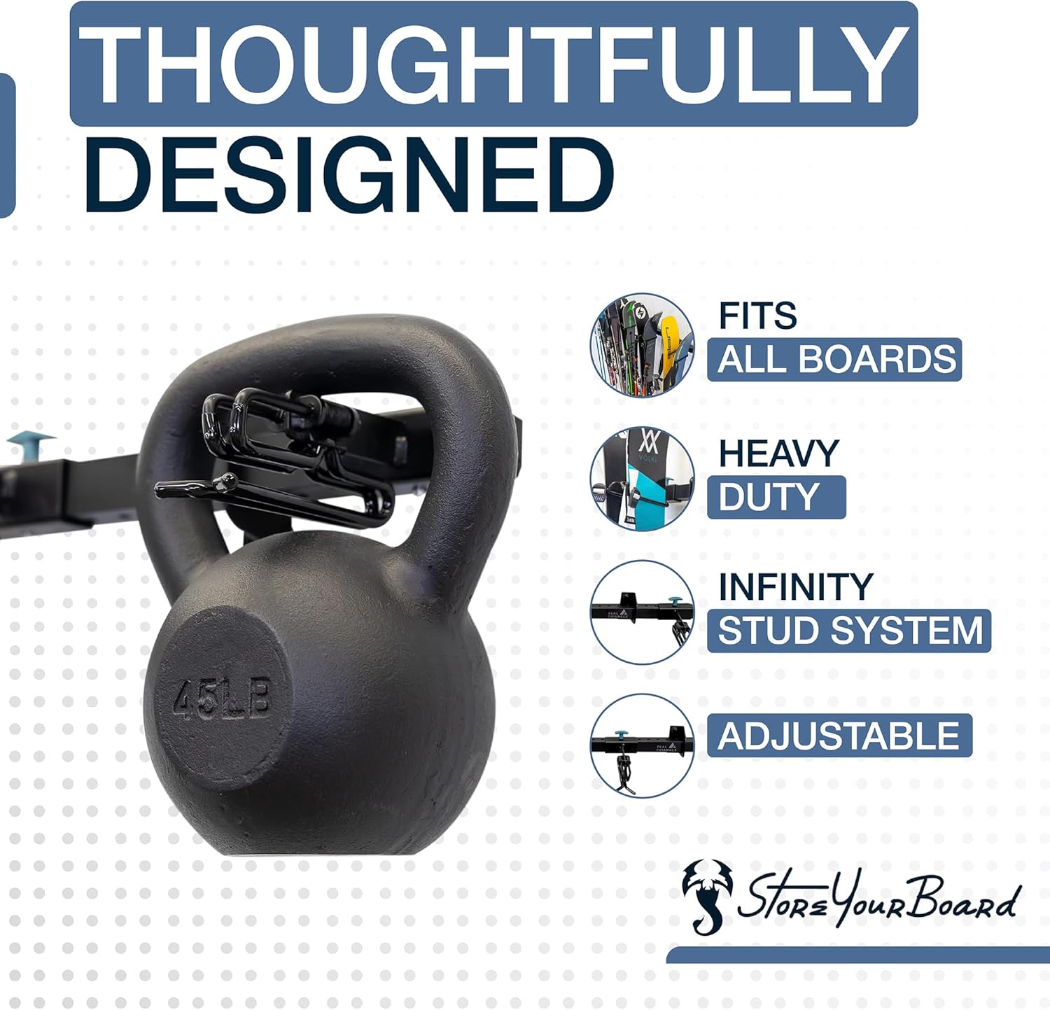 - INDUSTRIAL GRADE: Solid steel and aluminum support up to 300 lbs total, up to 25 lbs per ski storage attachment.