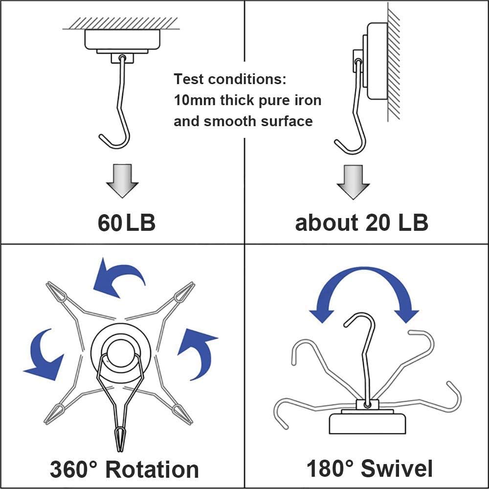 - INDUSTRIAL GRADE: 60LBS Capacity is based on horizontal application -- reduced by 2/3 if used vertically.The magnet hook is 67.5mm(2.66in) in length and 25mm(0.98in) in diameter.