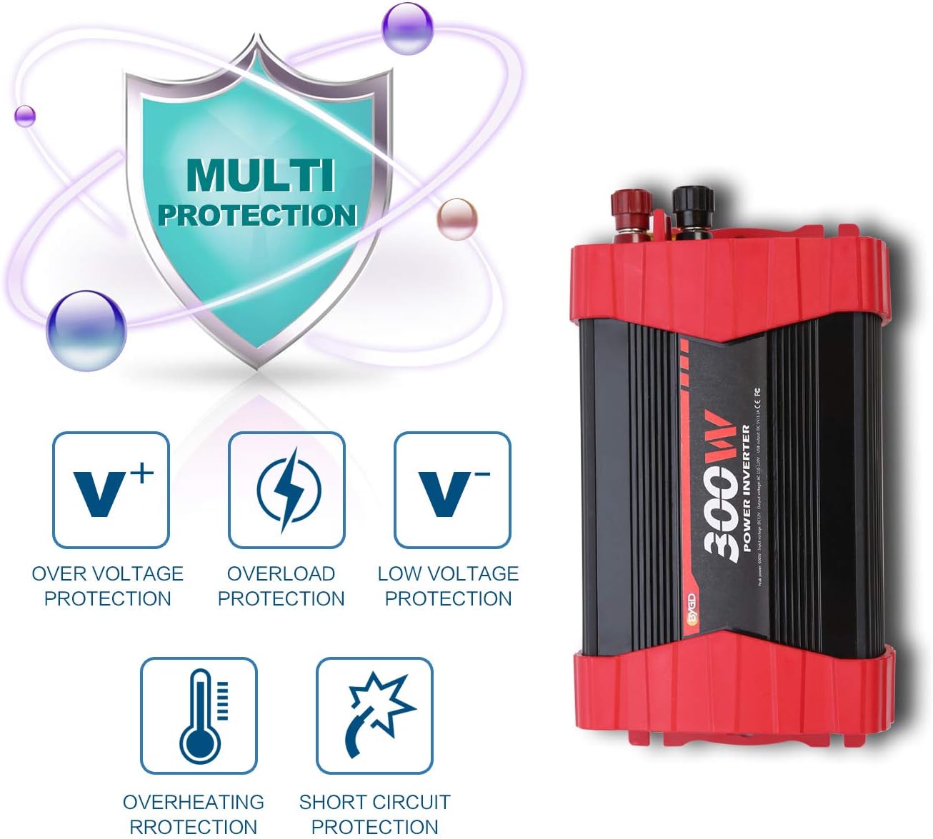 - ✔️【300W CAR POWER INVERTER】: BYGD car power converter is Light, Stable, Durable and High conversion efficiency. It equipped with 2 US standard AC sockets, 2 quick charging 2.4A USB ports and ON/OFF switch. 12V DC to 110V DC car plug adapter outlet provides stable continuous 300W power 600W peak Power