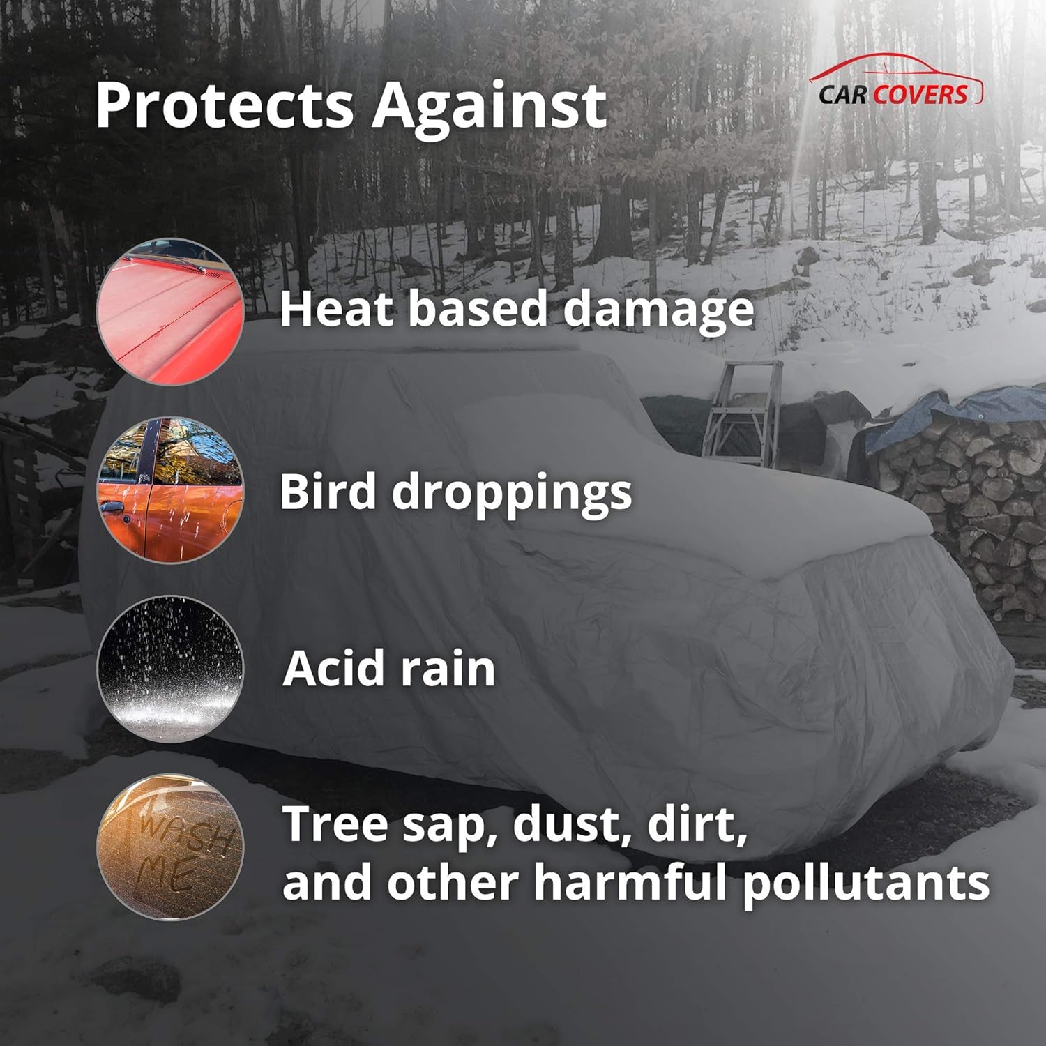 - Coverage : heat damage, UV rays, dust, rain, snow, light hail, pollutants, and other environmental contaminants