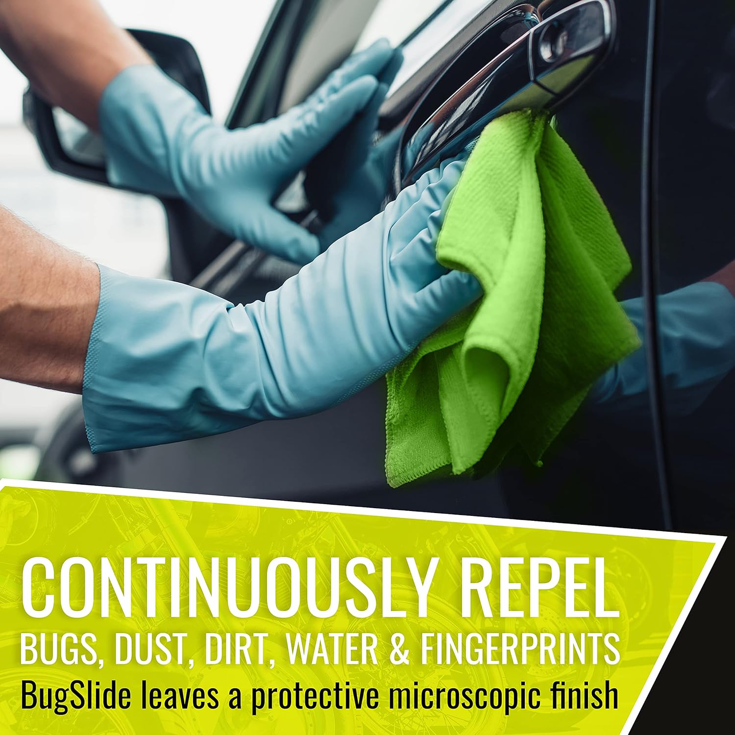 - Streak and Wax-Free – With BugSlide you will never need to wax your car again. Applied and paired best with a microfiber cloth towel to wipe clean, the release agent contains a UV filter for added protection and dries crystal clear with no yellow tint, film, build-up or powdery residue.