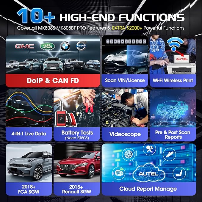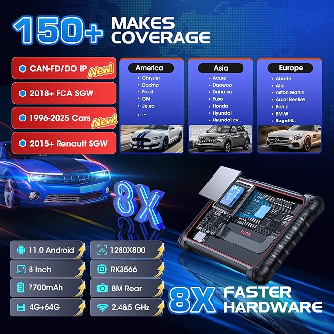 - 👍【2025 Autel MK900BT, 2.0 Newer Version of MK900 MX900 MK808S MK808BT PRO MX808S MK808Z】Full Level-up of Autel MK900 MX900 MX808S MK808BT PRO series, cost-effective than MP808 MS906 series, 2025 Autel flagship scanner MK900BT be your first choose! 6X faster hardware 2.0👉Android 11.0, Larger 8inch 1280*800, RK3566 Rockchip, 64GB/4GB Memory, 5G&2.4G WIFI, 8MP Camera, 7700mAh Battery. Plus, packed with top-notch features: ✅28➡40+ Services(=Autel Elite 2 PRO/Ultra)✅50➡3000+ Active Tests(as MS906 PRO)🆕DoIP&CAN FD✅Pre&Post Scan✅WiFi Print✅OE All system✅Scan VIN/License✅Work with BT506 to perform Battery Test (MK900/MX900/MK808S not support)✅NO IP Limit✅150+ brands, 20,000+ models.
