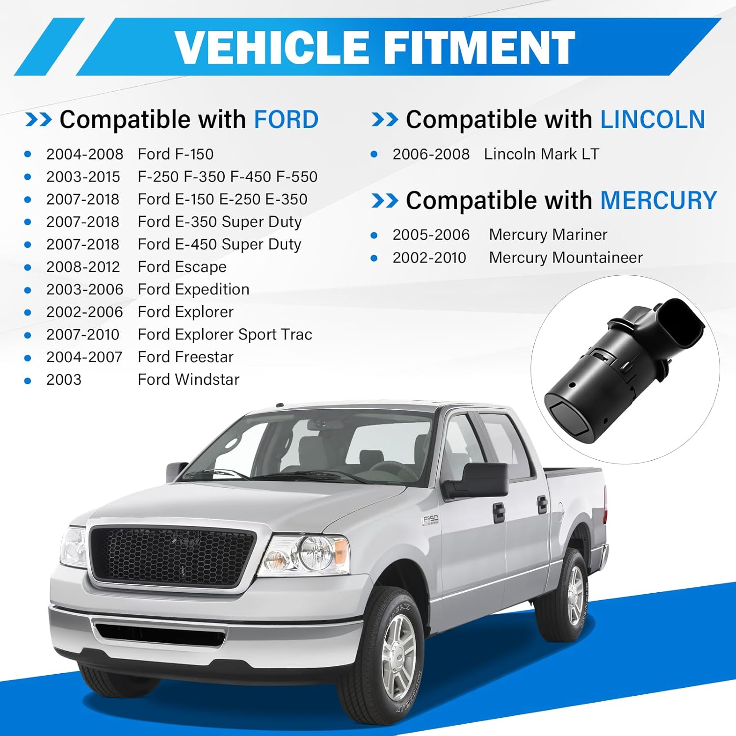 - The rear parking sensor Compatible with Ford - 2007-2018 Ford E-150/E-250/E-350 parking sensor| 2007-2018 Ford E-350/E-450 Super Duty assist sensor| 2008-2012 Ford Escape aid sensor| 2003-2006 Ford Expedition backup sensor| 2002-2006 Ford Explorer rear sensor| 2007-2010 Ford Explorer Sport Trac parking sensor| 2004-2008 Ford F-150 parkjing sensor| 2003-2015 Ford F-250/F-350/F-450/F-550 Super Duty assist sensor| 2004-2007 Ford Freestar aid sensor| 2003 Ford Windstar backup sensor
