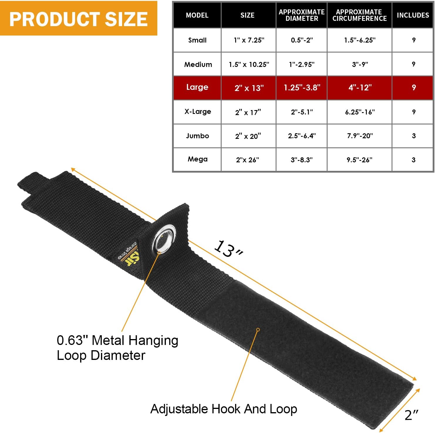 - Includes 9 pack heavy duty storage straps - Max Wrapping Capacity (Circumference) is 12 inches and Max Wrapping Capacity (Diameter) is 4 inches, measures 8 inches in length and 2 inches in width when single storage strap stored