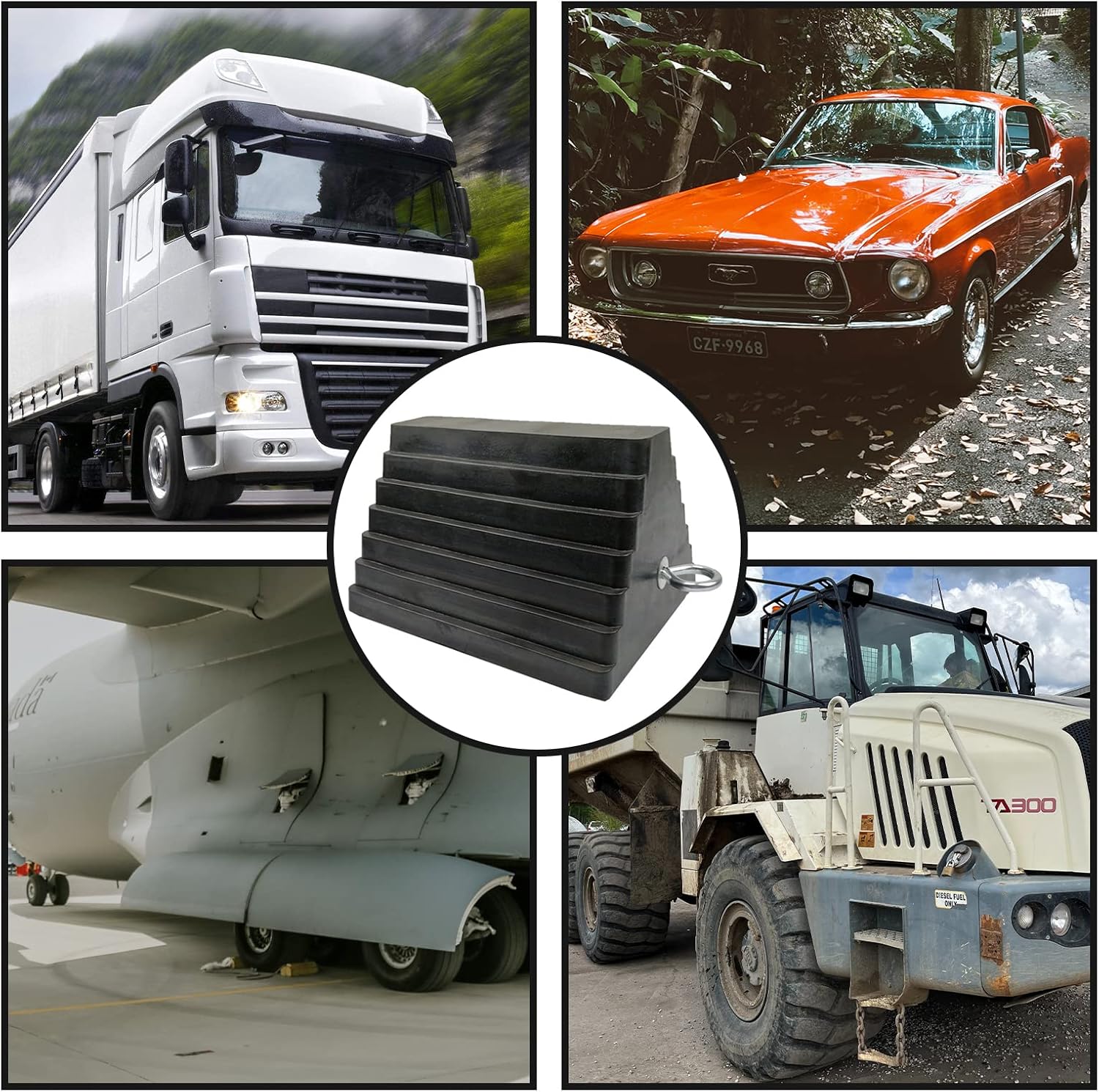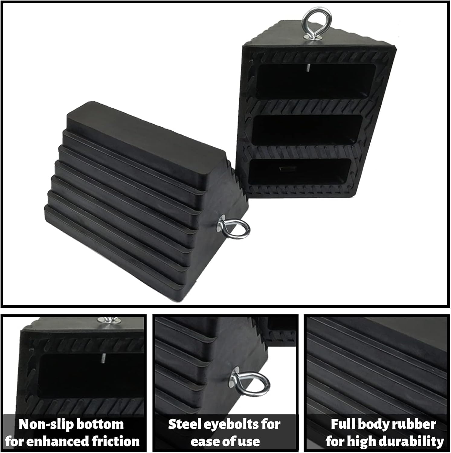 - Durable: These chocks are made from durable and robust rubber, long-lasting, weather-resistant, UV、oil resistant, and built to put up with heavy usage, that is far stronger than plastic chocks. All-weather construction for reliable performance in any climate