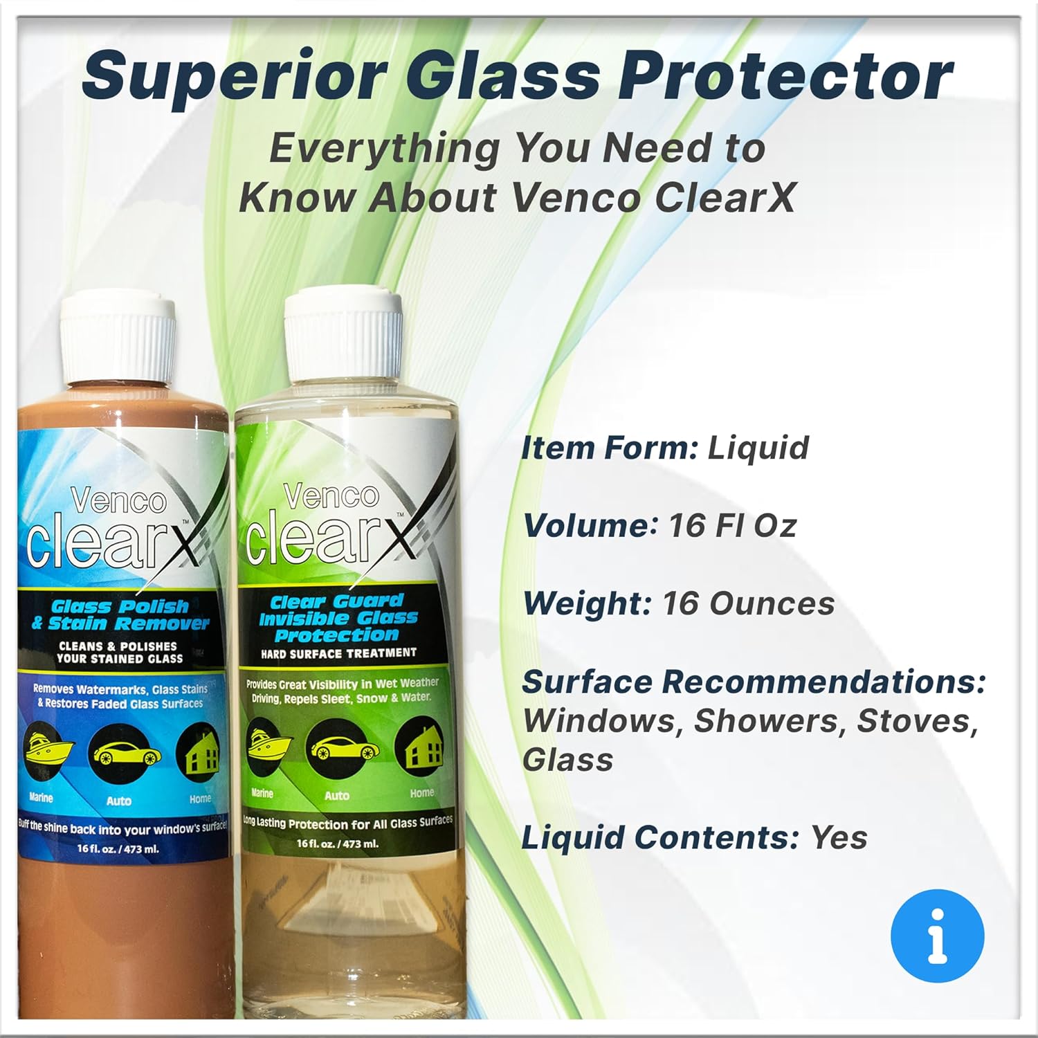 Venco Clear X Glass Polish & Protector - 16oz Kit for Removing Rust, Burnt-In Stains, Water Spots - Protects & Repels Water, Snow - Ideal for Yachts, Cars, Home Windows, RVs & More - Made in USA