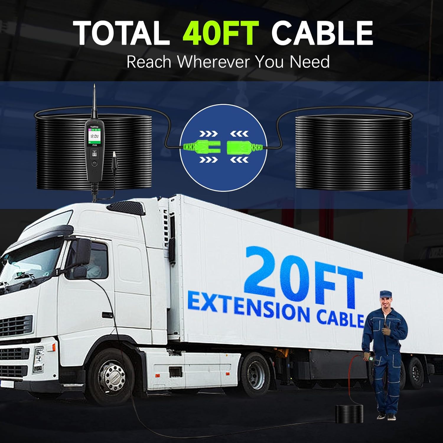 - 20FT Extension Cable, Built-in Flashlight: Cable length is gonna be important when troubleshooting the rear of a truck! Topdiag electric tester comes with extra 20ft extension cable in addition to its own 20ft cable, allowing you to access any position of the vehicle and test it. Ideal for trailer wiring, it can be tested along the vehicle without having to find a suitable ground point. The built-in flashlight is convenient for detection, even in the dark or dim environment, it can provide the best view for who need to work in night.