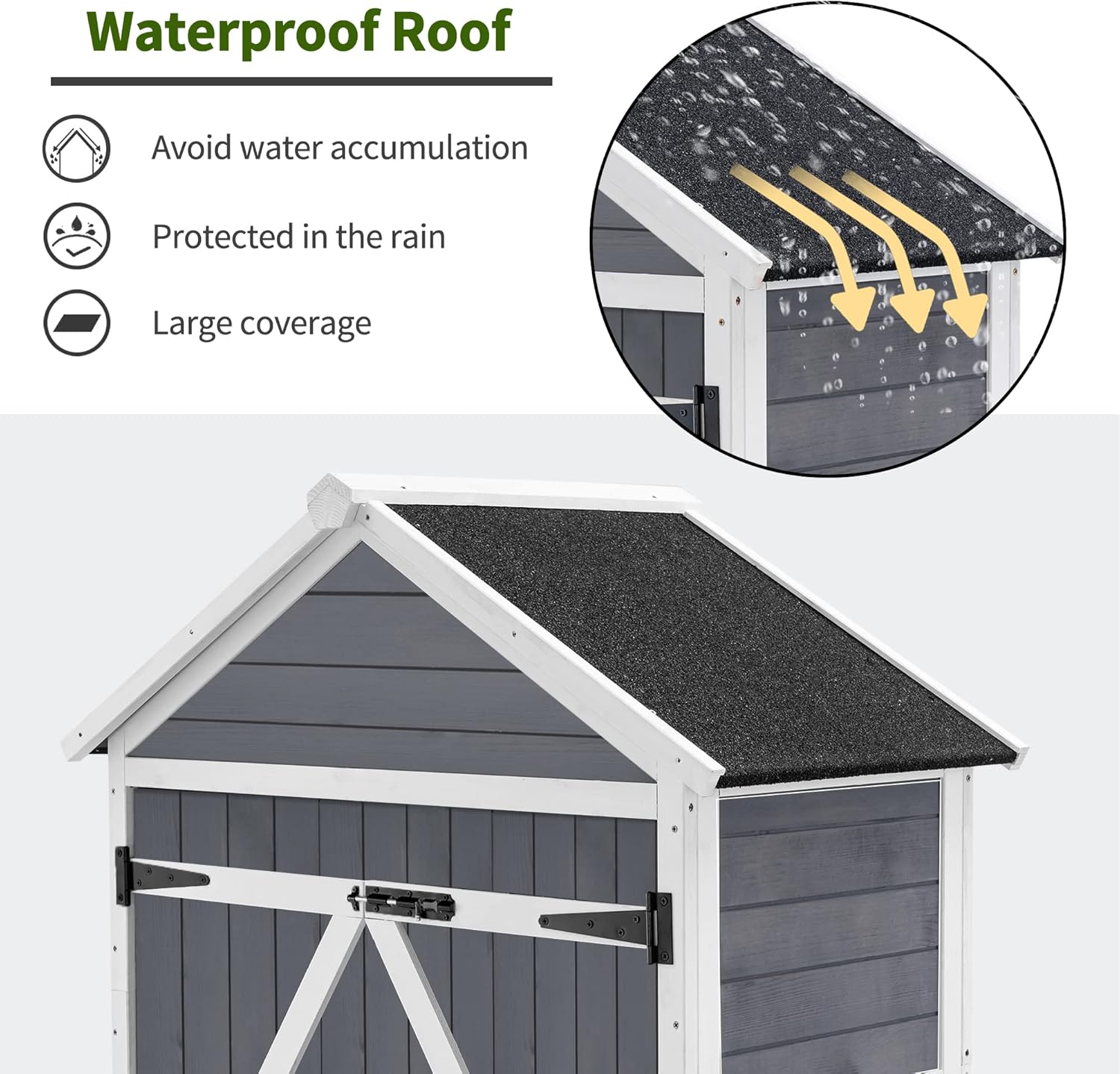- Waterproof Roof: The sloping asphalt roof is designed to be waterproof, preventing water accumulation and protecting your stored items; This weatherproof feature extends the lifespan of the vertical storage shed, keeping your tools safe from the elements