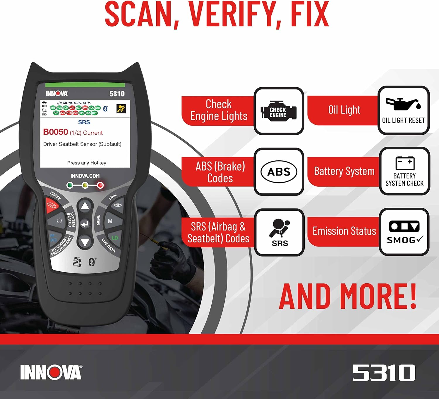 - MAINTAIN PEAK PERFORMANCE AND SAFETY ON THE ROAD - The 5310 OBD2 scanner diagnostic tool helps you quickly find and fix vehicle problems. Use the mobile scanner for car with the OBD2 Bluetooth application RepairSolutions2, trusted by 4M users, available on App Store or Google Play, for real-time solutions. With this car scanner, access verified fixes, purchase exact repair parts, view maintenance schedules, and explore Innova’s wireless code readers & scan tools database.