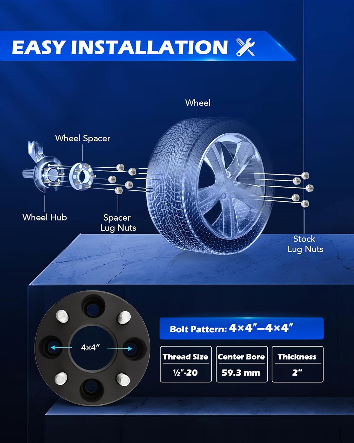 - PREMIUM MATERIAL: These 4-lug 4x4" wheel spacers are made from solid blocks of T6 aircraft-grade aluminum to keep them lightweight but highly durable and strong; the 16 Dacromat-coated 1/2"-20 bolts included are 7-10 times more corrosion resistant than the competition