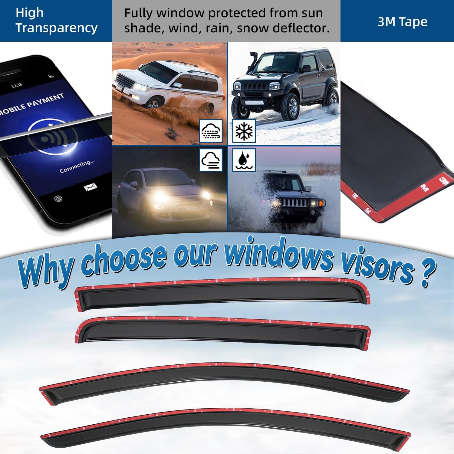 - Package Included: 4pcs front + rear vent window visors (3M Tape Included)