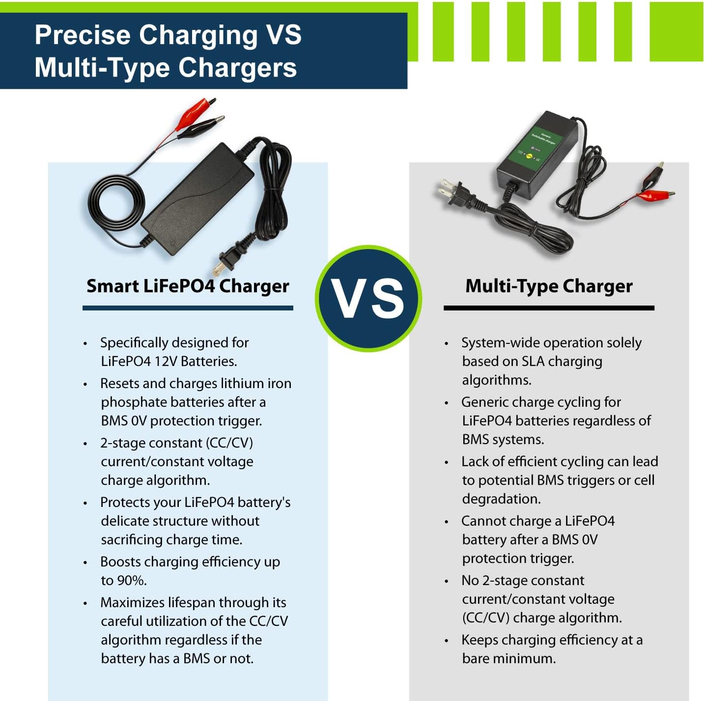 - Efficiently Easy : The charger protects your LiFePO4 battery's delicate structure by boosting charging efficiency and maximizing lifespan through its careful utilization of the CC/CV algorithm regardless if the battery has a BMS or not