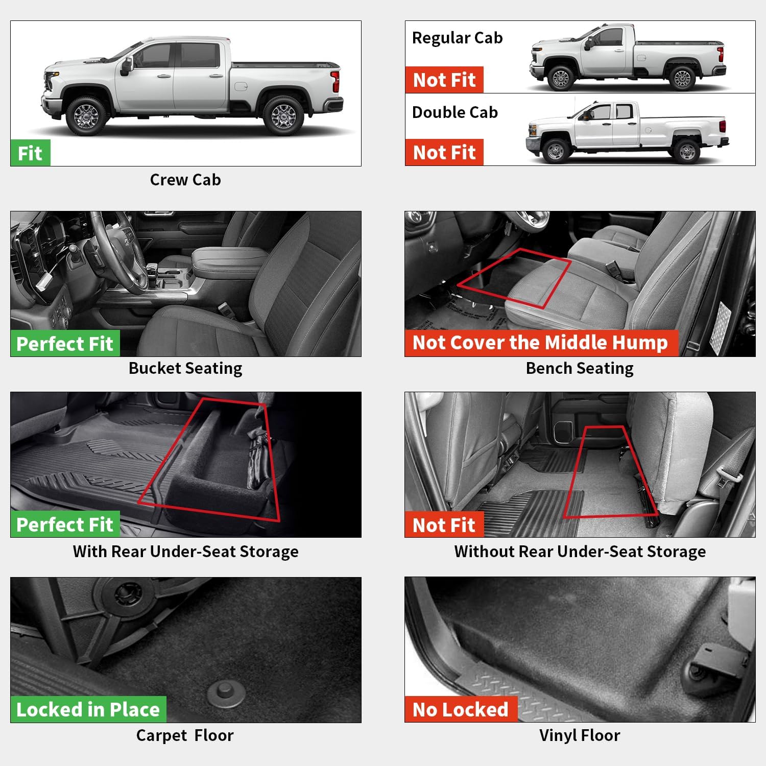 - 【Custom Fit】LASFIT Floor Mats perfectly fit for Chevy Silverado/GMC Sierra 1500 2019 - 2025 Crew Cab, for Chevy Silverado/GMC Sierra 2500HD 3500HD 2020 - 2025 Crew Cab Carpeted Floor (Not Fit Regular Cab/Double Cab; Not Fit Vinyl Floor), with Rear Under-Seat Storage. Note: Not Fit 2nd Row Plastic Storage(If you need mats without Rear Under-Seat Storage, pls search Asin: B0DMRVM6WY)